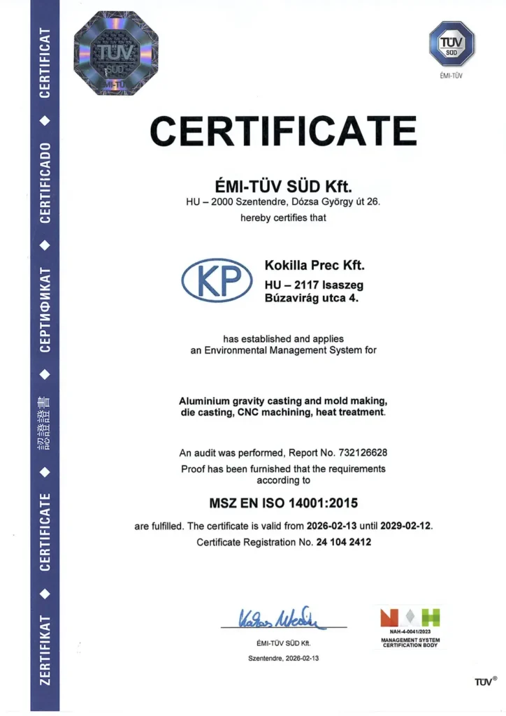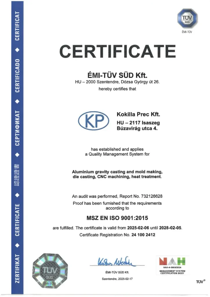 The implemented quality management system complies with the requirements of ISO 9001:2015 (MSZ EN ISO 9001:2015) and is binding for the production activities of Kokilla Prec Ltd.
